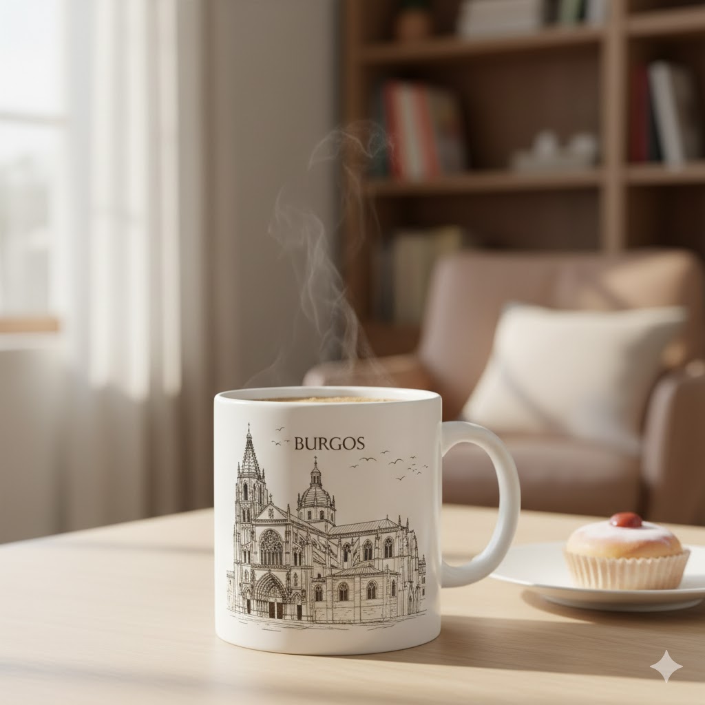Taza de cerámica con una ilustración artística de la Catedral de Burgos. Un recuerdo práctico y elegante para disfrutar de la ciudad cada día.